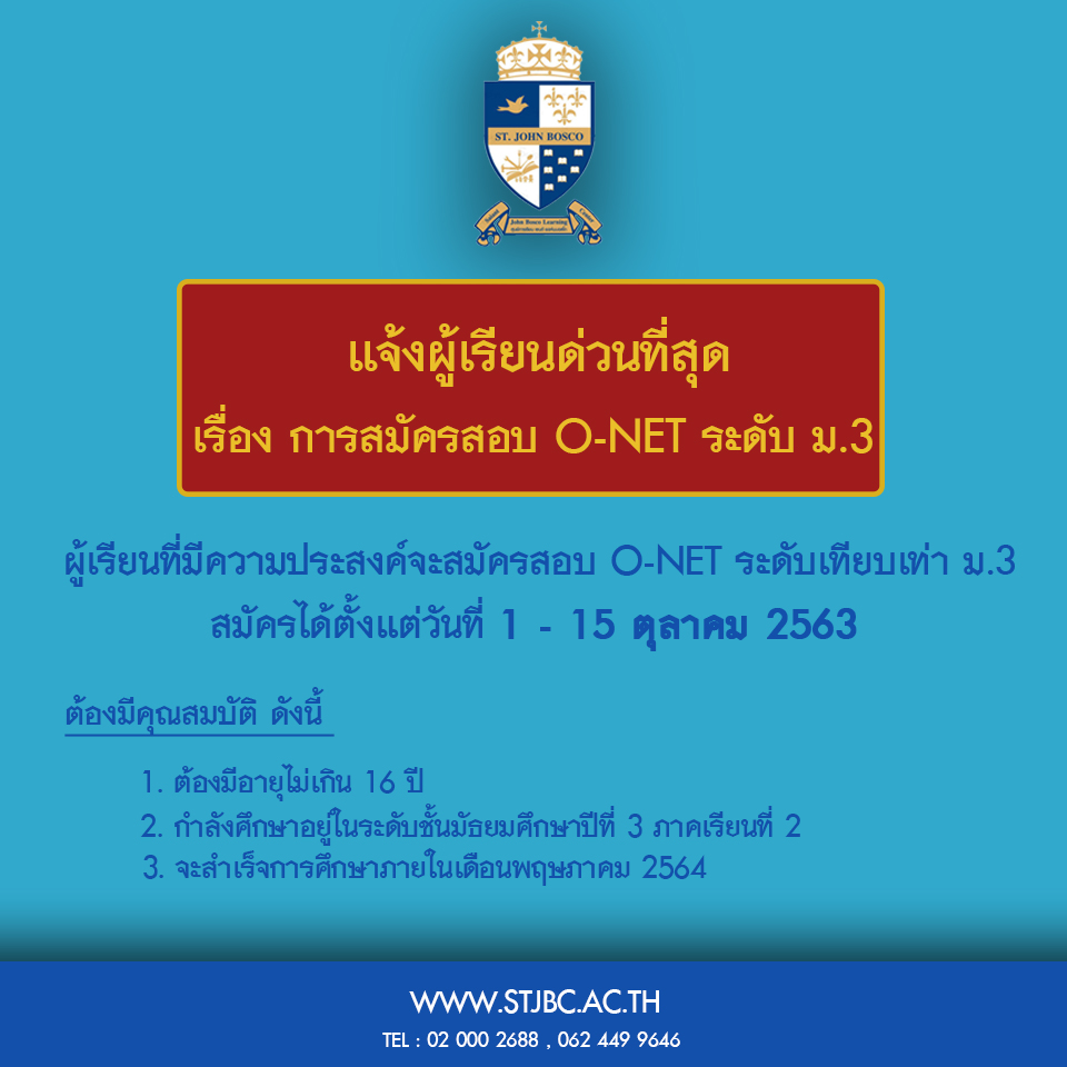 ประกาศ ด่วนที่สุด ภายในวันที่ 15 ตุลาคม 2563 ผู้เรียนที่จะสมัครสอบ O-NET ม3. สามารถสมัครได้ตั้งแต่วันนี้ ถึงวันที่ 15 ตุลาคม 2563 1. คุณสมบัติผู้เรียนอายุไม่เกิน. 16 ปี2. ต้องศึกษาอยู่ ม3. เทอม 2 เท่านั้น 3. จะจบการศึกษาภายใน เดือนพฤษภาคม 2564 เท่านั้น โดยสมัครได้ที่ คลิกที่นี่เพื่อสมัครสอบ (ผู้เรียนต้องกรอกข้อมูลในเว็บดังกล่าวเท่านั้น) หากสงสัยหรือไม่เข้าใจรายละเอียด สามารถสอบถามได้ที่อาจารย์ที่ปรึกษา หรือ ศูนย์การเรียน 020002688. 0982612487. 0624499646.
